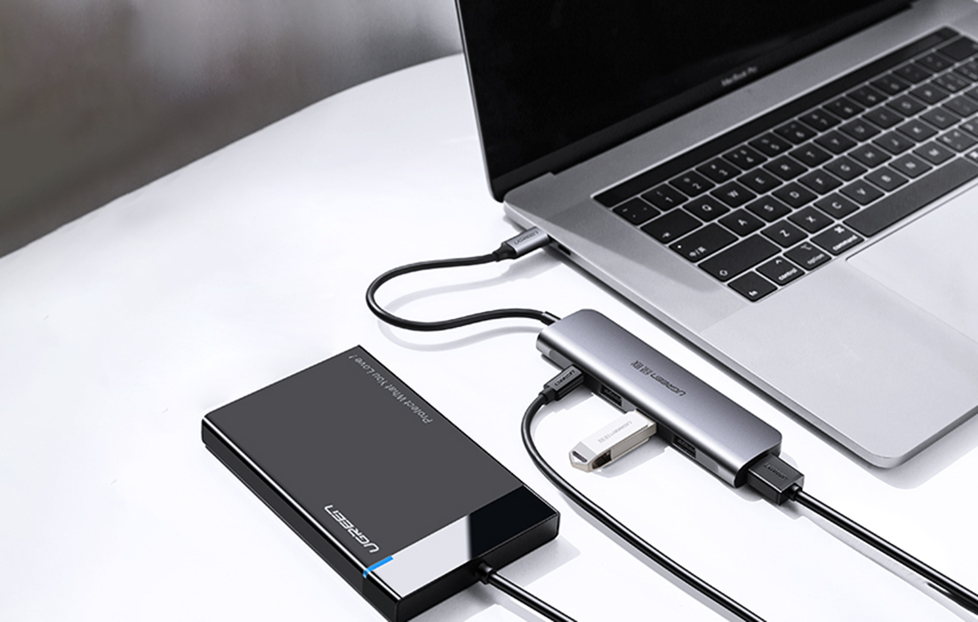Chcesz zwiększyć możliwości swojego komputera? To prostsze, niż może się wydawać! Niewielki hub marki UGREEN został wyposażony w porty USB-C i 3 USB-A, za pomocą których z łatwością podłączysz do laptopa na przykład pendrive’a lub telefon. Co więcej, gniazdo HDMI umożliwia wyświetlanie zdjęć, filmów czy prezentacji na dużym ekranie.