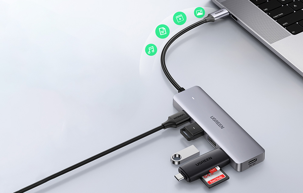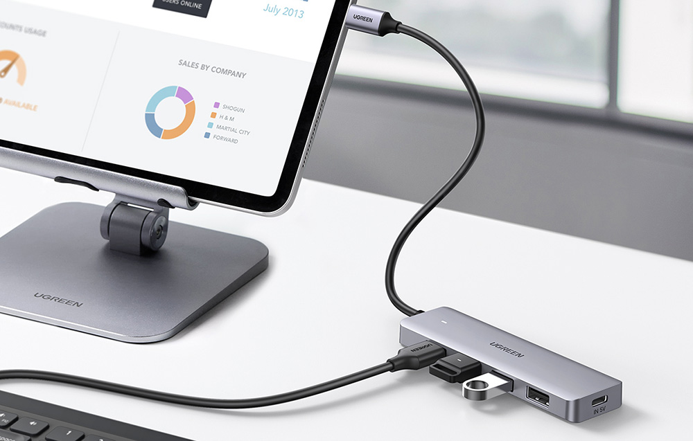 Adapter USB-C firmy UGREEN, pozwala na podłączenie wielu urządzeń jednocześnie. Posiada 4 x USB 3.0 oraz 1 x USB-C. Jest doskonałym rozwiązaniem dla osób potrzebujących podłączyć do komputera wiele urządzeń w jednym czasie.