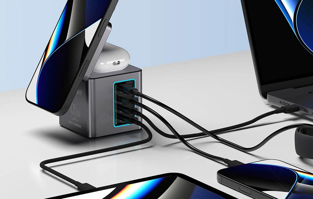 Equipped with 3 USB-C ports and 1 USB-A port, as well as 2 wireless charging zones (15 W for the phone and 5 W for headphones), the BW-i113 intelligently distributes power, maximizing charging speed. As a result, you can charge a Samsung Galaxy S22 to 60% in 30 minutes, an iPhone 16 to 54%, and a MacBook Pro to 45%. Moreover, the charger supports fast charging protocols such as PD or QC.