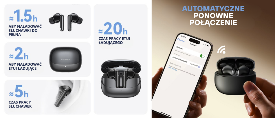 Ciesz się nawet 5 godzinami nieprzerwanego odtwarzania muzyki na jednym ładowaniu słuchawek. Dodatkowo, etui ładujące pełni funkcję powerbanku, co pozwala na dłuższe słuchanie ulubionych utworów. Dzięki temu nigdy więcej nie będziesz martwić się o wyczerpanie baterii słuchawek w najmniej odpowiednim momencie!